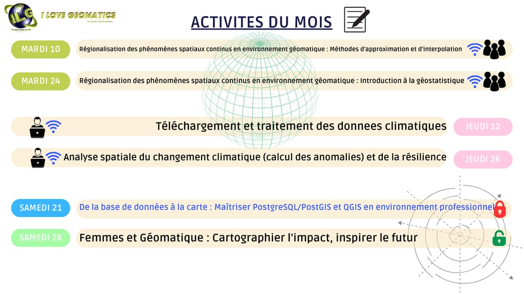 Nous sommes une équipe engagée dans la promotion de la géomatique, sensibilisant sur son importance pour le développement socio-économique et environnemental. I Love Geomatics aspire à devenir un acteur clé dans la promotion des technologies géospatiales, en réunissant des passionnés et des professionnels pour partager des connaissances, encourager l'innovation et former les futures générations. L'association cherche à utiliser les outils géomatiques pour résoudre des défis complexes dans divers secteurs, tout en contribuant à l'avancement de la recherche scientifique et à la gestion durable des ressources.